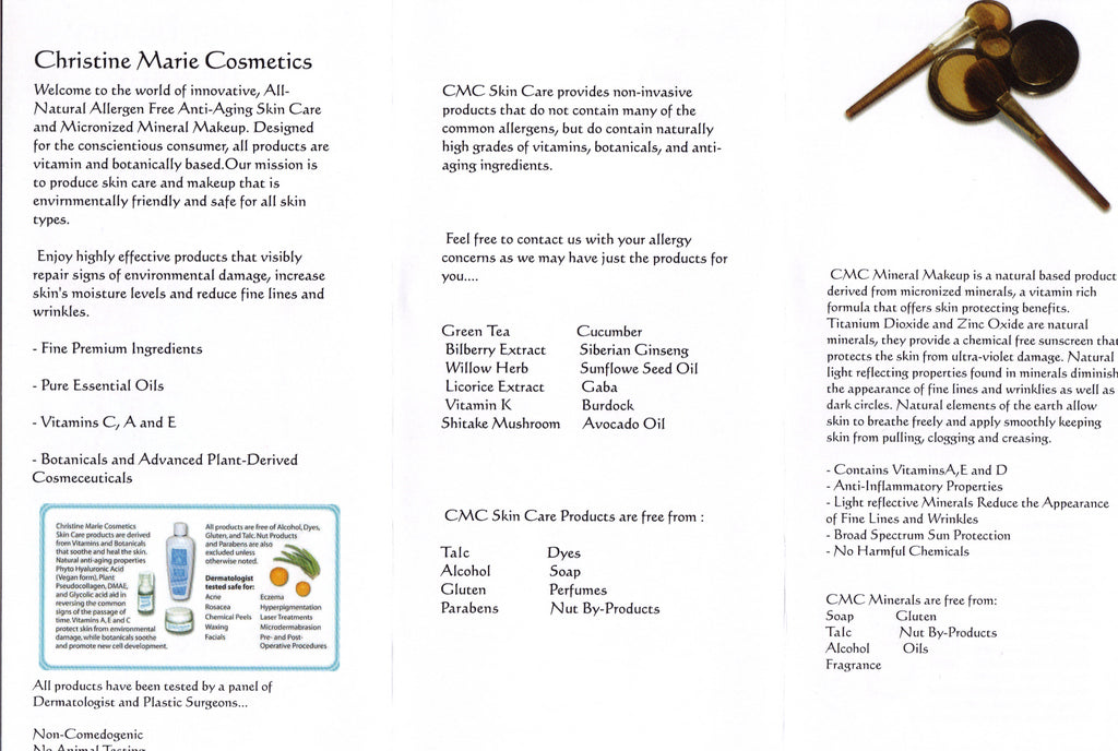 After twenty seven years as a professional in the beauty industry, and years of frustration in observing and dealing with the allergies resulting from the use of commercial skin care and makeup products, it became Christine Dreier’s pasion to develop natural, non-invasive productss that work, and CMC was born. Our...
